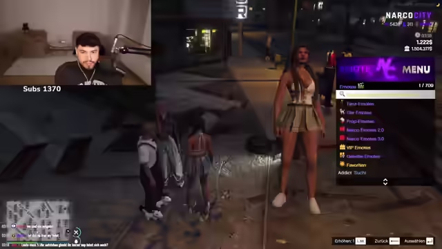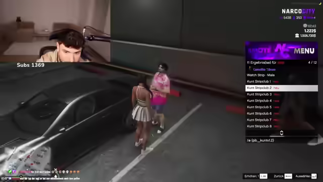 01:56:44Die Streamerin startet ein Rollenspiel in GTA Online, indem sie vorgibt, neu im Spiel zu sein. Sie sucht nach einem Hotspot und interagiert mit anderen Spielern. Dabei trifft sie auf einen Charakter, der einen Hund spielt, und spricht einen Mann an, der am Büffelpark Alkohol trinkt. Sie vermutet, dass er ein Drogendealer sein könnte. Später trifft sie auf ein Paar und fragt, ob sie zusammen sind, was zu einer interessanten Unterhaltung führt. Die Streamerin bietet dem Mann an, etwas trinken zu gehen, was Eifersucht bei seiner Begleitung auslöst. Es entwickelt sich ein Gespräch über Beziehungen, Eifersucht und die Bereitschaft, neue Leute kennenzulernen. Die Streamerin und der Mann fahren in seinem Auto davon, während die eifersüchtige Begleiterin zurückbleibt. Während der Fahrt unterhalten sie sich über verschiedene Themen, darunter die Stadt, in der sie sich befinden, und ihre persönlichen Vorlieben.