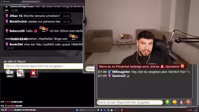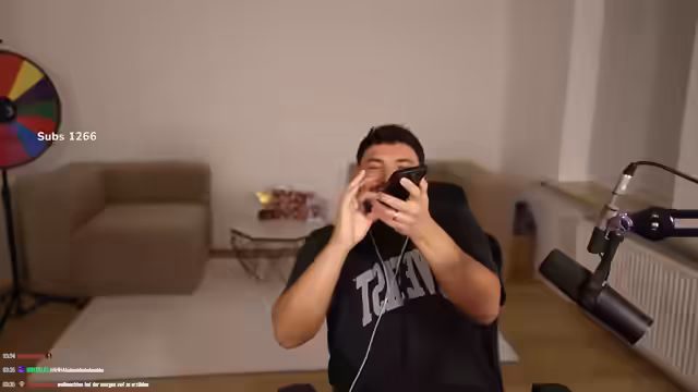 04:15:28Der Streamer bemerkt die späte Uhrzeit und diskutert mit einem Zuschauer über ein Roulette-Feature. Es entsteht Verwirrung, als ein dritter Benutzer (Erik Hartmann) im selben Roulette-Raum erscheint. Der Streamer versucht, private Kommunikation herzustellen, bemerkt technische Schwierigkeiten mit der App und kritisiert die unintuitive Funktion, die ungewollte Gruppeninteraktionen erzwingt. Die Interaktion endet frustriert mit dem Plan, später per WhatsApp zu kommunizieren.
