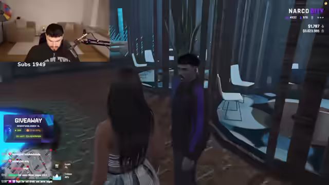 02:52:55Nach dem Abbruch des privaten Gesprächs wechselt der Stream zu einem öffentlichen Gewinnspiel, bei dem Adventskalender verlost werden. Streamer furo99 verlangt von den Teilnehmenden, dass sie im Chat mit '1' reagieren und explizit an, dass nur Spieler des Spiels 'Narko' teilnehmen dürfen, um Bots und nicht-interessierte Teilnehmer auszuschließen, und ruft die Community auf, aktiv teilzunehmen.