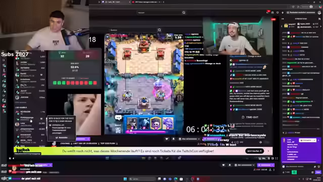 01:48:20Es kommt zu einem Streit zwischen zwei Zuschauern, bei dem der Streamer eingreift und zur Ruhe mahnt. Ein Zuschauer aus Köln und ein anderer aus Berlin tauchen auf, und es entwickelt sich ein hitziges Gespräch über Wohnsituationen und Ehre. Der Streamer stellt zwischen den Auseinandersetzungen die Musik bereit und beginnt zu rappen, was die Stimmung im Chat kurzzeitig ändert, bevor die Konflikte wieder in den Vordergrund treten.