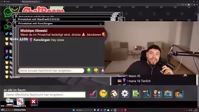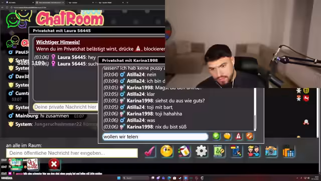 02:26:58Der Streamer interagiert mit einem Pärchen (Franzi und Leo) in einem Chatraum, das Snapchat herunterladen soll, um weiter zu kommunizieren. Er verarscht sie subtil, indem er ihre Annahmen in Frage stellt und ihre Bereitschaft zum Download kritisch hinterfragt. Die Szene verdeutlicht die Dynamik von Catfishing und Täuschung in Online-Chats. Der Streamer nutzt die Gelegenheit, um die Risiken solcher Interaktionen humorvoll anzusprechen.