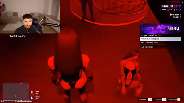 03:57:05Das Setting wechselt zu expliziteren Szenen. Der Streamer fordert dominante Handlungen wie das Bellen oder Miauen von Samira, die dies zunächst ablehnt. Später folgt ein Tanz mit sexuellen Anspielungen, wobei die Stimmung zwischen Flirt und einvernehmlichem Rollenspiel pendelt.
