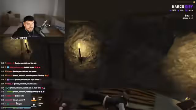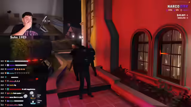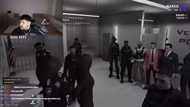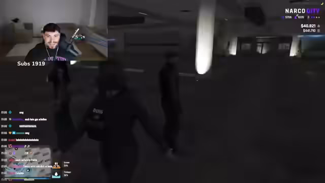 01:09:45Der Streamer wechselt in den Narco City-Modus von GTA. Er organisiert ein Team, um eine Mission zu starten, und unterhält sich parallel mit einem Nutzer über dessen Hobbys und Beruf. Das Gameplay wird durch konstanten Chat begleitet, bei dem der Streamer die Aktionen kommentiert und auf Anfragen der Zuschauer reagiert. Der Fokus liegt auf der teambasierten Action im Spiel.