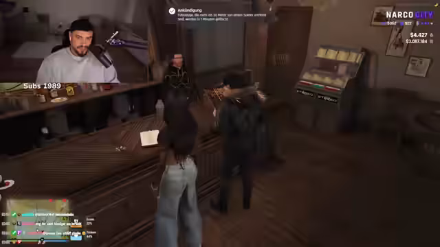 03:29:45Nach dem Besuch in einer Kneipe eskalierte die Interaktion massiv. Es kam zu aggressiven Dialogen und Drohungen. Der Streamer verdächtigte einen Unbekannten mit einem Namensanfang 'G', die Situation werde eskalieren, und sprach wiederholt von Waffen. Die Atmosphäre wurde zunehmend konfrontativ und bedrohlich. Die Eskalation ist Thema und Inhalt.