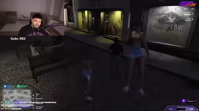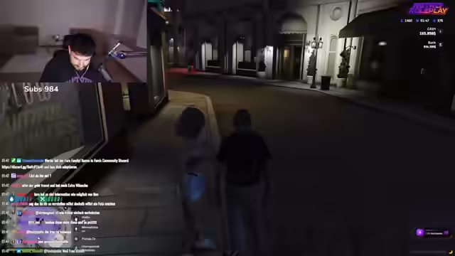 01:00:41Der Streamer kehrt zum Rollenspiel zurück und trifft sich erneut mit Ali, um die Handlung fortzusetzen. Der Streamer agiert weiterhin als Zuhälter und simuliert einen Anruf, um Ali gegenüber dem Kunden als verabredet erscheinen zu lassen. Es kommt zu einer unerwarteten Störung durch einen weiteren Anrufer namens James, was das Rollenspiel unterbricht und zu Verwirrung führt.