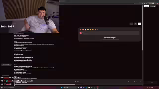 00:32:04Es kommt zu technischen Problemen mit der Kamera und dem Mikrofon. Der Streamer weigert sich, das Gesicht zu zeigen, und begründet dies mit der Angst vor Screenshots. Es folgen persönliche Gespräche über die Beziehung und die Vergangenheit. Der Streamer versucht, die Person zu beruhigen und Vertrauen aufzubauen. Gleichzeitig werden technische Fragen geklärt und die Zuschauer über die Probleme informiert. Die Stimmung ist gespannt, aber auch humorvoll geprägt.