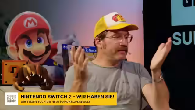 00:15:13Der Stream beginnt mit einer Begrüßung zur anstehenden Nintendo Switch 2 Veröffentlichung. Die Konsole wurde nur wenige Stunden vor dem Stream erhalten und wird erstmals gezeigt. Es wird erwähnt, dass die Konsole mit einem großen Day-One-Patch ausgeliefert wird, der zwingend installiert werden muss. Der Moderator vergleicht die Switch 2 visuell und funktional mit der Vorgängerkonsole und zeigt die Größe, das wärmere Farbbild und die größeren Joy-Cons. Dabei wird erwähnt, dass die neuen Joy-Cons nicht ganz so fest sitzen wie bei der Switch 1, aber hochwertiger wirken.