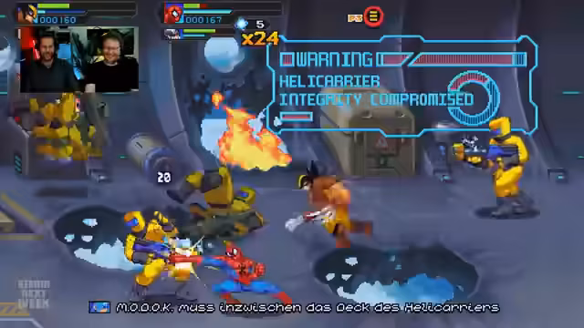 00:09:05Der Stream startet mit der Demo von Marvel Cosmic Invasion, einem klassischen Beat'em-Up, in dem Spieler:innen Marvel-Helden im Koop-Modus steuern. Der Host testet das Spiel mit einem Co-Moderator, beschreibt das Spielprinzip, das an Tunesien-Erinnerungen weckt und Charakterwechsel sowie Spezialangriffe kombiniert. Er hebt hervor, dass die Demo bis mindestens Sonntag auf Steam verfügbar ist und sich positiv über die optische Qualität und den Nostalgie-Faktor des Spiels äußert, auch wenn er technische Details wie Animationen und die Darstellung der Charaktere kritisch betrachtet.