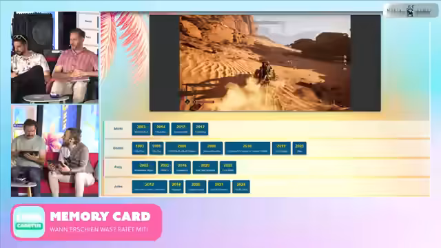 05:26:58Nach mehreren Aktivitäten wie Improvisationstheater und Bällebad-Wettbewerben startet eine Runde Memory Card. In diesem Spiel müssen die Teilnehmer die Erscheinungsjahre von verschiedenen Videospielen richtig einordnen. Die Runde wird schnell zu einem Wettbewerb zwischen Daniel, Felix, Jules und Michi, wobei jeder参赛者 sein eigenes Wissen nutzt. Es kommt zu einigen knappen Entscheidungen und falschen Tipps, was die Spannung erhöht.