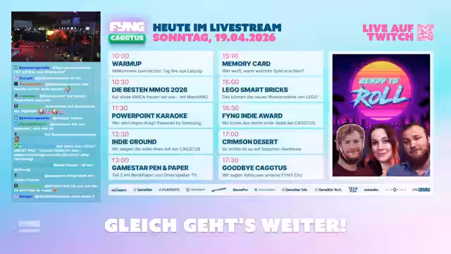 00:14:12Der dritte und letzte Tag der Cactus beginnt mit einer entspannten Atmosphäre. Moderatoren begrüßen das Publikum und kündigen das Gewinnspielprogramm an, darunter einen hochwertigen Custom-PC im Diablo Immortal X Doom Design. Ein weiteres Highlight ist ein signierter Lego Millennium Falcon von Anthony Daniels, der für ein Social-Media-Gewinnspiel auf Instagram ausgelobt wird. Zusätzlich kann man um 18:30 Uhr einen Gaming-Monitor am Riesenrad gewinnen. Neben den Spielen wird auch der Lego-Aufbau gezeigt, der für später im Tag geplant ist.
