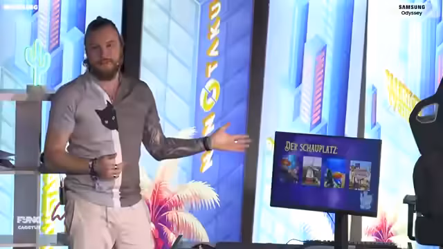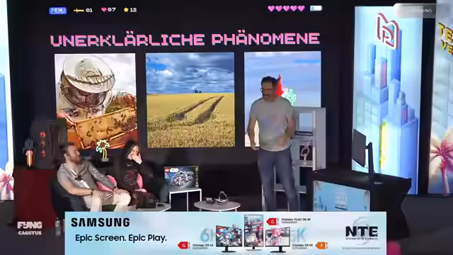 01:43:28Bei der Cactus fand eine unterhaltsame Einheit PowerPoint-Karaoke statt, präsentiert von Samsung. Moderator und Teilnehmer hatten jeweils zehn Minuten Zeit, eine ihnen unbekannte PowerPoint-Präsentation vorzustellen. Während Felix als "Strauss Zelnik" humorvoll GTA 7 als Mittelalter-Märchen-Spiel vorstellte, mit Hauptfigur Benjamin Blümchen und böser Hexe Felix Rick, trat Jules als Minimap-Experte auf. Er behandelte die Bedeutung der Minimap in Videospielen und betonte die Wichtigkeit von hochauflösenden, ultraschnellen Monitoren wie dem Samsung Odyssey G80 HF mit 5K-Auflösung für optimale Darstellung.
