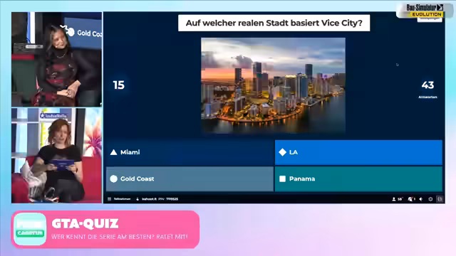 02:16:22Auf der Cactus wird ein großes GTA-Kahoot-Quiz veranstaltet, bei dem das Wissen der Teilnehmer über die GTA-Reihe getestet wird. Das Quiz wird per QR-Code oder Spiel-Pin erreicht und umfasst Fragen zu den einzelnen Teilen der Serie, Easter Eggs, Fake-Brands und historischen Entwicklungen. Besonders große Verwirrung stiftet die Frage nach der Veröffentlichung von GTA 5, wobei die Mehrheit die richtige Antwort (2013) nicht kennt.