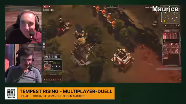 03:29:10Die Spieler erkunden das zerstörte Szenario, das an Command & Conquer erinnert. es werden die Ressourcen 'Tempest' geerntet und das System der Spezialfähigkeiten und Doktrinen diskutiert. während ein Spieler mobile Raffinerien nutzt, was der andere als Cheaten bezeichnet, beschäftigt sich der Streamer mit der Übersichtlichkeit des Spiels und der Komplexität des Tech Trees. es werden technische Aspekte wie Upgrades und Bau-Radien angesprochen und die schnelle Zeit-zum-Tod der Einheiten festgehalten.