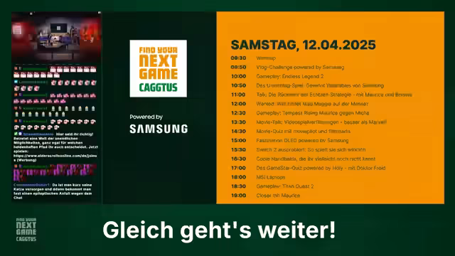00:13:02Der zweite Tag der CAGGTUS, als der beste Tag des Events bezeichnet, beginnt mit einem lockeren Warm-up. Der Moderator begrüßt seine Kollegen Iris und Felix und kündigt ein vollgepacktes Programm an. Dazu gehören unter anderem ein Manhunt-Spiel auf dem Messegelände, eine neue Quizshow des Teams Dr. Freud sowie Talks zu Handheld-Kuriositäten und Videospielverfilmungen. Ein besonderes Highlight ist das Vorstellen von seltenen Geräten wie dem Virtual Boy.