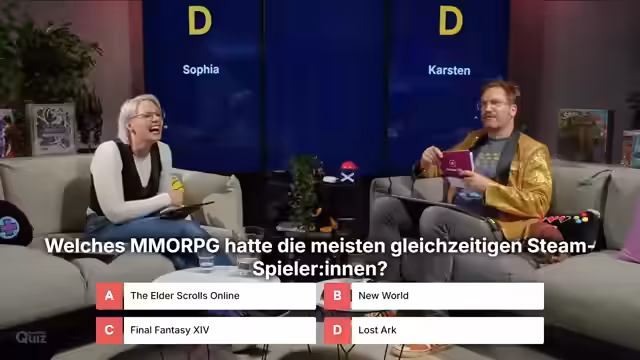 02:58:24Die Quizrunde beleuchtet auch Spiele, die von der Community nachtrauert werden werden. Bei der Frage nach der Laufzeit von Wildstar tippt Carsten auf fünf Jahre, die richtige Antwort sind jedoch vier Jahre (2014-2018), was Sophia richtig hat. Eine Schätzfrage zielt auf das Jahr des Abonnenten-Höchststands von World of Warcraft ab. Sophia tippt auf 2014 und Carsten auf 2012, doch das Allzeithighow von 12 Millionen Abonnenten wurde bereits 2010 erreicht, was Carsten einen Punkt bringt. Die Frage nach der Anzahl der WoW-Add-ons ist mit 10 ein knappes Rennen, bei dem beide Teilnehmer die richtige Antwort haben. Carsten muss jedoch alle Namen aufzählen und macht dabei einen Fehler bei Shadowlands, was zu einem Punktabzug führt.