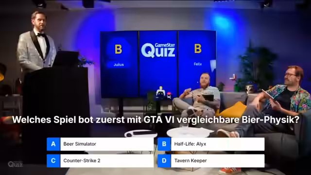 02:33:12Das Quiz startet mit einer Frage zur physikalischen Darstellung von Bier in Videospielen, die in der Vergangenheit für Aufsehen gesorgt hat. Die Multiple-Choice-Frage zielt darauf ab, welches Spiel zuerst eine vergleichbare Bier- oder Flüssigkeitsphysik gezeigt hat. Die richtige Antwort, Half-Life Alyx, wird aufgedeckt und es wird erklärt, dass es sich dabei um einen Shader-Trick, keine echte Physiksimulation, handelte. Die erste Buzzer-Frage lautet nach dem Namen der Biermarke in GTA (Pisswasser), die korrekt beantwortet wird. Danach folgt eine Frage zum besten Counter-Strike-Zweierteam, wobei Frankreich als korrektes Land genannt wird.
