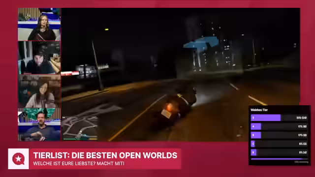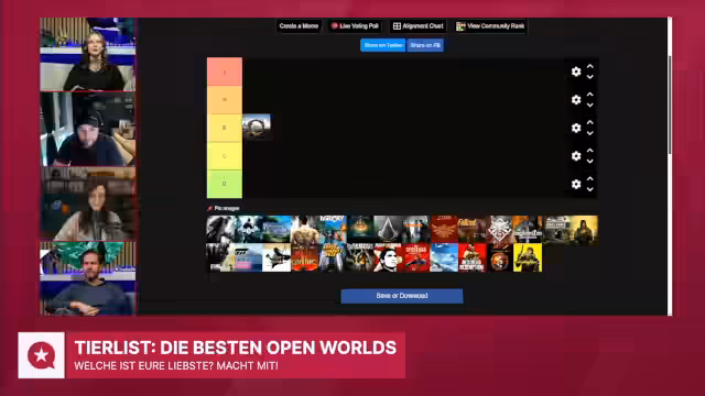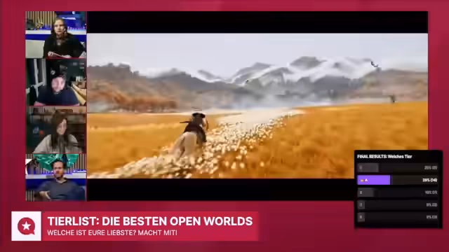 03:48:35Während des Streams wird auf das bevorstehende Gaming-Festival, die GamesCom in Leipzig, vom 17. bis 19. April hingewiesen. Der Stand von GameStar wird als besonders erwähnt. Anschließend wird die Red-Dead-Reihe besprochen. Daniel lobt den ersten Teil besonders für sein Gefühl und die Charaktere, während Chiara beide Teile für ihre Erkundungswert schätzt. Dennis und Daniel äußern zwar einige Kritikpunkte, sind sich aber einig, dass die Red-Dead-Reihe in das S-Tier gehört. Die Mehrheit des Chats stimmt dieser Einschätzung zu, woraufhin die Serie als S-Tier bestätigt wird.