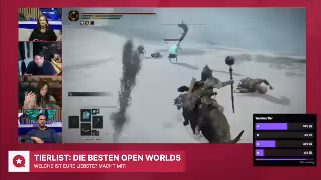 03:38:51Bei Elden Ring gehen die Meinungen auseinander. Chiara lobt die anfängliche Erkundung und die Wow-Momente, kritisiert aber die sich wiederholenden Dungeons und Bosskämpfe. Dennis teilt diese Kritik, sieht aber dennoch den Genuss der Erkundung, insbesondere im Bereich Limgrave. Daniel hingegen ist ein großer Fan der Welt und hat positive Erinnerungen an das gemeinsame Erkunden. Der Chat ist gespalten zwischen S und C, was zu einer kontroversen Diskussion führt. Letztlich wird Elden Ring als A-Tier-Titel eingestuft.