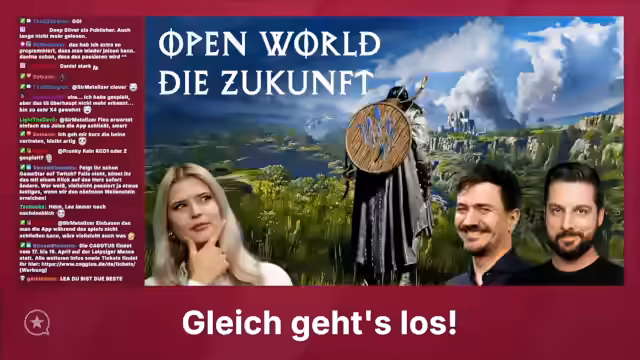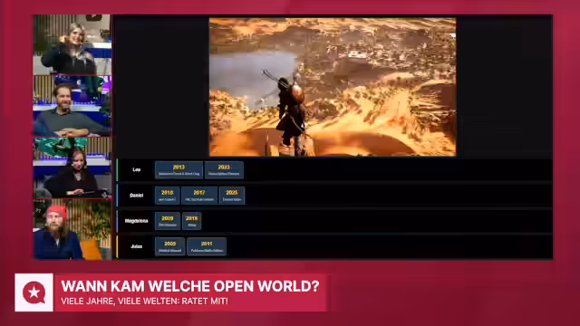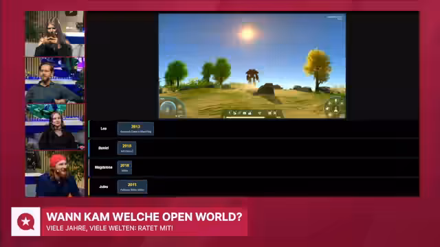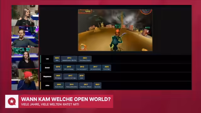 01:14:20Nach dem intensiven Tech Talk wechselt der Stream zu einem unterhaltsamen Segment. Es wird ein Ratespiel mit dem Arbeitstitel 'Dating Game' oder 'Memory Card' eingeführt. Die Teilnehmer – Lea, Magdalena, Julius und ein Moderator – erhalten Screenshots aus 175 verschiedenen Open-World-Spielen und müssen erraten, in welchem Erscheinungsjahr das jeweilige Spiel liegt. Das Spiel soll das Publikum einbeziehen und das Wissen der Teilnehmer über die Geschichte der Open-World-Genre auf die Probe stellen.