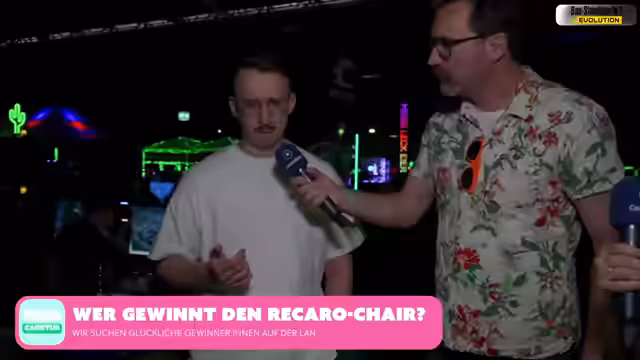 02:47:32In der LAN-Area wird ein Recaro Exo Racing Blue Gaming Chair im Wert von 1000 Euro verlost. Die Gewinner wird durch ein Stuhlrennen ermittelt. Teilnehmer müssen eine kreative Idee für einen Gamestar Gaming Song einbringen. Die Ideen reichen von Metal-Versionen von DuckTales bis zu Power Metal-Songs. Nach mehreren Versuchen bleiben nur zwei Kandidaten übrig.