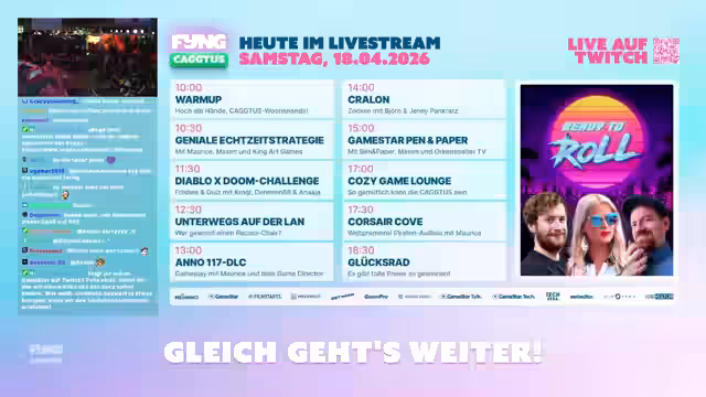 09:01:48Der Streamer berichtet von seinen persönlichen Highlights der Cactus, wie die Cozy Gaming Lounge und geplante Indie-Ground-Präsentationen. Morgen gibt es Fortsetzungen wie Pen & Paper und das Glücksrad. Weitere Highlights sind Die Besten MMOs 2026, Memory Card (Spieleerkennung), PowerPoint-Karaoke und WarMap Gaming-Tabu. Zum Abschluss wird ein Raid geplant.