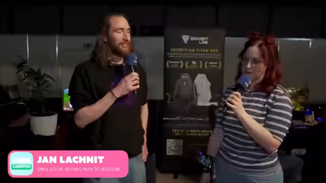 07:27:45Jan von Speloop stellt das rundenbasierte Spiel 'Kevins Path to Wisdom' vor. Der Spieler steuert einen schönen Zauberer-Lehrling, dessen Gesicht gestohlen wurde. Das Spiel zeichnet sich durch einzigartige Zaubermechaniken aus, bei denen der Spieler Muster malt, um Zaubersprüche zu wirken. Das Spiel ist bereits auf Steam erschienen.