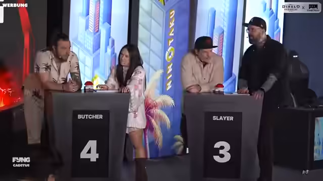 02:37:26Bei einer Frage nach dem Endboss von Doom 2 wird erklärt, dass es sich um die 'Icon of Sin' handelt - eine Textur auf einer Wand, die mit Raketen getroffen werden muss. Später wird der Endboss in Doom Eternal erwähnt. Eine zusätzliche Frage behandelt das Witzlevel 'Whimsyshire' in Diablo 3. Team Butcher holt auf und gewinnt am Ende mit 8 zu 4 Punkten.