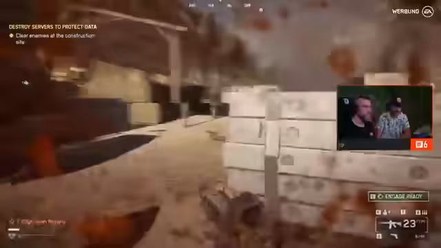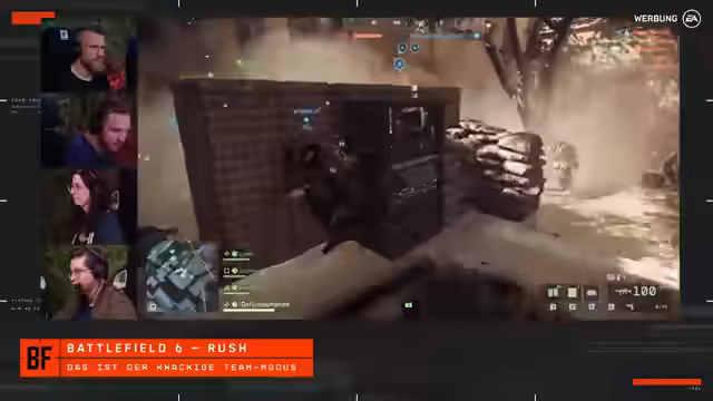 01:05:19Der Stream wechselt nun zum Mehrspieler-Teil. Der Fokus liegt auf dem Rush-Modus, der 16 gegen 16 Squads gegeneinander antreten lässt. Es geht darum, taktische Ziele (MCOMs) anzugreifen und zu verteidigen. Die Angreifer haben eine begrenzte Anzahl an Tickets, die Verteidiger unendlich. Zuschauer werden eingeladen, über den Community-Server 'Gamestar' mitzuspielen. Die Streamer nehmen hierfür verschiedene Klassen und Loadouts ein.