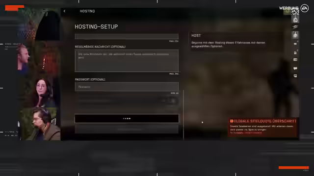 01:41:38Nach dem Quiz wechselt das Stream-Team zum Durchbruch-Modus, der als 'weniger kompliziert' als Rush beschrieben wird. Es kommt jedoch zu erheblichen technischen Problemen. Das Team kann keinen Community-Server erstellen, da die globale Spielquote überschritten wird. Nach mehreren vergeblichen Versuchen gelingt es schließlich, ein Bot-Match zu starten, um Gameplay zu zeigen und die Wartezeit zu überbrücken.
