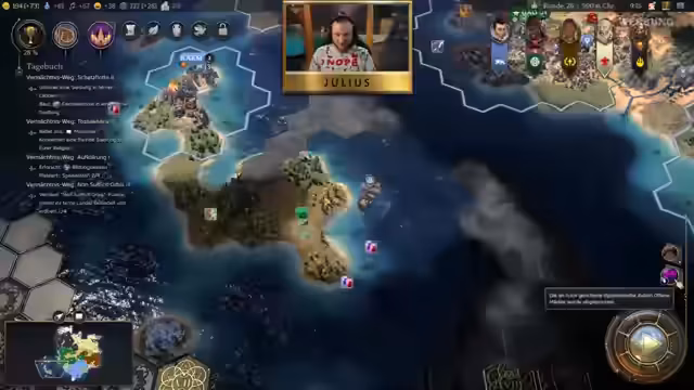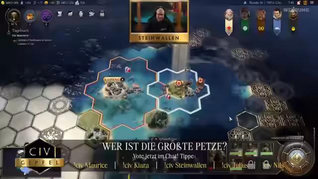 05:10:21Die Spieler sind nach vier Stunden CIV-Gipfel erschöpft, aber die kriegerischen Auseinandersetzungen gehen weiter. Chiara hält sich aus den Kriegen heraus, was ihr den Vorwurf der Kriegstreiberei einbringt. Mirko versucht als Berufsdiplomat, die Gemüter zu beruhigen und zum Frieden zu motivieren. Maurice ärgert sich darüber, dass Julius sich in sein Naturwunder eingezeigt hat, obwohl es ein Abkommen gab. Es wird über Militärhilfe und Forschung diskutiert, aber auch über Waffenbrüderschaft und Friedensschlüsse. Nils wird für seine Passivität im Angesicht der drohenden Niederlage kritisiert, während er sich als Mongole sieht, der das Blut der anderen zum Kochen bringen will. Es wird erklärt, dass Siegpunkte und Vermächtnispunkte nicht sicher sind, sondern bis zum Schluss umkämpft werden können. Nils macht eine anzügliche Bemerkung, die vom Moderator kommentiert wird. Ein technischer Fehler reißt die Spieler aus der Konzentration. Mirko erzählt von seinen Erfahrungen als Diplomat und gibt Einblicke in Verhandlungsstrategien. Die Zuschauer werden gefragt, wer beim Civ-Gipfel mit offenen Augen geschlafen hat. Mirko berichtet von einer skurrilen Begegnung mit einem chinesischen Gesprächspartner, den er mit Russisch umdrehen konnte. Julius verliert eine Stadt, was seine Chancen auf die Meisterschaft schmälert.