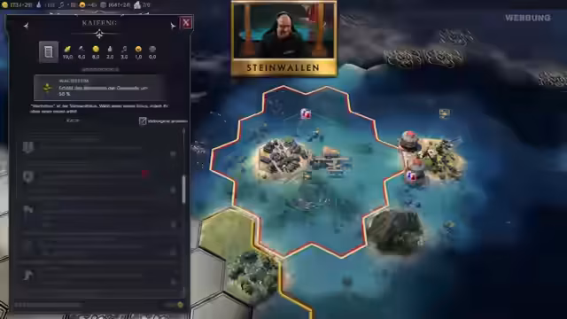 01:13:15Mehrere Spieler ziehen mit ihren Schiffen Richtung Osten, um ein Achievement zu erreichen: Wer siedelt zuerst in fernen Ländern? Nils hat Maurice' Siedler gesehen, was zu einer Kriegsgrundsuche führt. Nils, der die Mongolen spielt, freut sich über seine Angriffsstärke und erklärt den Krieg. Die Landkarte wird enger, und Nils profitiert von den Vorteilen der Mongolen im Angriff. Maurice ist mit seinen Truppen unterwegs und wird von Nils angegriffen. Steinwallen und Nils schließen einen Militärpakt. Nils hat eine Kriegserklärung in Siedlerform von Maurice erhalten, was seinen Handlungsspielraum einschränkt. Maurice hat Katzina vor Nils' Nase gegründet. Es wird diskutiert, ob Nils' Kriegslust gestillt wird, wenn seine Städte brennen. Julius fragt sich, was passiert, wenn Nils zu Ende ist und seine Städte brennen. Es wird überlegt, ob Wien gefallen wäre, hätte es im 20. Jahrhundert eine andere Entwicklung gegeben.