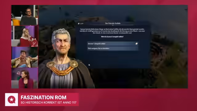 00:05:44Die Sendung beginnt mit einer Begrüßung und der Vorstellung des Hauptthemas Anno 117 Pax Romana, das bereits in den vergangenen Tagen den Kanal dominierte. Es wird ein Deep Dive in das Setting Rom versprochen. Als Gäste sind Micha, bekannt aus dem GameStar Talk, der eine komplizierte Beziehung zu Anno hat, Gaius, ein Strategiespiel-Fan und Rom-Liebhaber, sowie Michaela Ziedlow, eine Expertin aus dem Bereich Archäologie und Bauforschung, eingeladen. Die erste Frage an die Runde und den Chat lautet, wie oft sie an das alte römische Reich denken. Gaius gibt an, dass er alle zwei bis drei Tage daran denkt, oft im Zusammenhang mit Strategiespielen oder der römischen Geschichte. Micha, ebenfalls geschichtsinteressiert, erwähnt, dass er in Süddeutschland oft auf römische Überreste stößt und seine Urlaube in Italien ihn immer wieder mit Rom in Kontakt bringen, sodass er mindestens einmal pro Woche daran denkt. Michaela, aufgrund ihres Berufs als Archäologin, kann die Frage schwer trennen, schätzt aber mindestens zweimal täglich, wenn nicht öfter, auch im Privatleben.