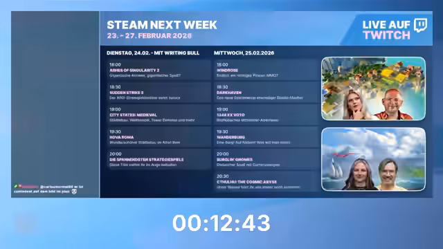 00:00:00Der Stream beginnt nach technischen Startschwierigkeiten mit der Begrüßung der Zuschauer. Der Moderator stellt Writing Bull als Strategiespiel-Experten vor. Es wird das Steam Next Fest angekündigt, bei dem über vier Spiele gesprochen und acht Demos gezeigt werden. Der Stream läuft parallel auf zwei Kanälen mit separaten Chats, und technische Probleme wie eine flackernde Kamera werden angesprochen, während die Produktion im Hintergrund arbeitet, um diese zu beheben.
