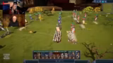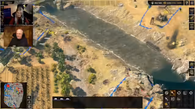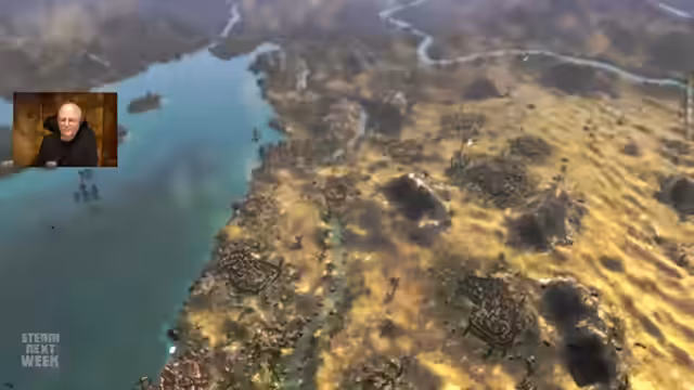 01:28:13Der Versuch, die Truppen über den Fluss zu bringen, gestaltet sich schwierig, da die Brücken zerstört sind. Nur ein Schiff steht zur Verfügung, das jedoch nicht alle Einheiten auf einmal transportieren kann. Die Einheiten müssen aufgeteilt werden, wobei die Truppen aus dem GameStar-Chat links und die anderen auf der rechten Seite übersetzen sollen. Währenddessen tauchen Performance-Probleme auf, die durch Anpassungen der Grafikeinstellungen gelindert werden.