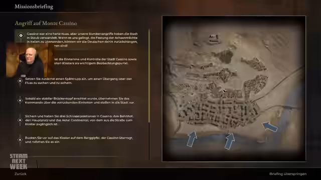 01:23:29Die Demo von Sudden Strike 5 konzentriert sich auf die Mission 'Angriff auf Monte Cassino', die eine Schlacht im Zweiten Weltkrieg nachzeichnet. Der Spieler muss zunächst einen Brückenkopf über einen Fluss sichern, um dann in die Stadt vorzustoßen. Die Ziele sind der Bahnhof, der Hauptplatz und das Hotel Continental, gefolgt von der Einnahme des Klosters auf dem Berg. Die Mission wird mit einem klaren Zielvorgang und deutscher Sprachausgabe präsentiert.