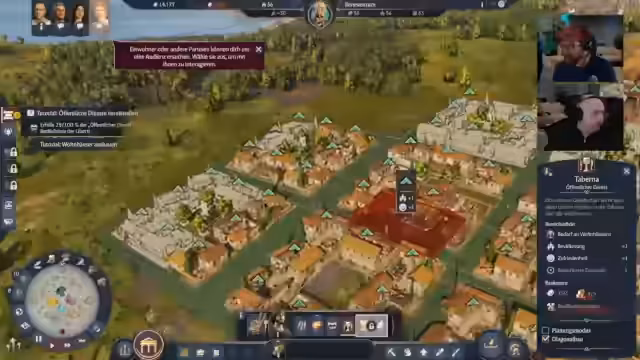 01:51:57Die Spieler konzentrieren sich auf die Deckung der Grundbedürfnisse ihrer Bevölkerung, beginnend mit Nahrungsmitteln wie Sardinen. Es wird darauf hingewiesen, dass die Informationskästchen im Spiel wichtige Hinweise geben und gelesen werden sollten. Für die Landwirtschaft, insbesondere den Haferbrei, wird ein Areal in der Nähe eines Berges geplant, um später Aquädukte anschließen und die Effizienz der Farmen verdoppeln zu können. Die Bedeutung von Marktplatz und Taverne wird hervorgehoben, da sie das Bevölkerungskontingent erhöhen und Boni wie zusätzliche Bevölkerung oder Einkommen bieten. Die Reichweite dieser öffentlichen Gebäude ist entscheidend für die Stadtplanung. Es wird erklärt, dass die Verarbeitungszeit von Rohstoffen und Produkten oft ein 1:1-Verhältnis aufweist, was die Planung erleichtert. Das Sonderheft bietet hierfür detaillierte Baupläne. Kleidung wird als nächstes Bedürfnis angegangen, wofür Hanf und Spinnereien benötigt werden. Die Platzierung von Geschäften innerhalb der Wohnviertel wird diskutiert, um die Bevölkerung glücklich zu machen.