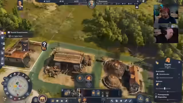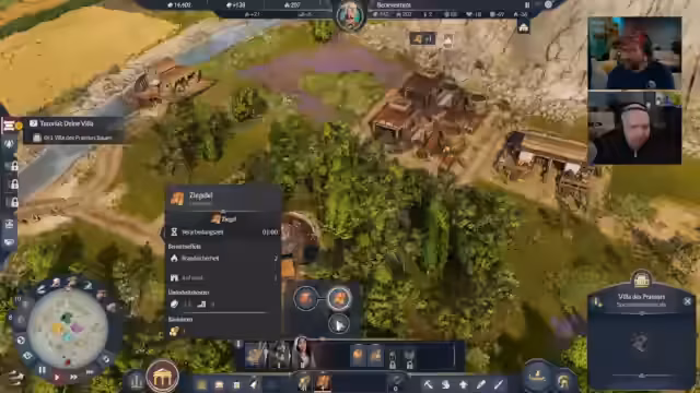 01:44:59Nach dem Start des Spiels diskutieren die Spieler über ihre bevorzugten Baustile: Effizienz- oder Schönbau. Während André sich als Effizienz-Bauer outet und Copy-Paste bevorzugt, wird Gloria als Schönbauerin gelobt, deren Siedlung es sogar auf ein Poster im Sonderheft geschafft hat. Das Intro des Spiels wird kurz übersprungen, da viele Zuschauer es bereits aus der Demo kennen könnten. Die ersten Bauphasen beginnen mit dem Platzieren des Kontors und dem Bau von Straßen. Anschließend wird die Holzproduktion in Angriff genommen, wobei André aufgrund des langsamen Spieltempos im Multiplayer gleich mehrere Baumfäller und Sägewerke errichtet. Es wird erklärt, dass jeder Baumfäller ein Sägewerk benötigt und die Rohstoffe entweder vom Fabrikanten, dem nächsten Lager oder Kontor bezogen werden können. Die Häuser werden in einem 2x2-Würfelmuster mit einer freien Fläche in der Mitte für Ornamente gebaut, um das Ansehen zu steigern. Das Kopierwerkzeug wird vorgestellt, um Siedlungen schnell zu erweitern. Trotzdem kommt es zu einem Arbeitskräftemangel, da die Bewohner erst nachziehen müssen.