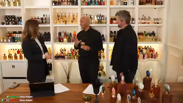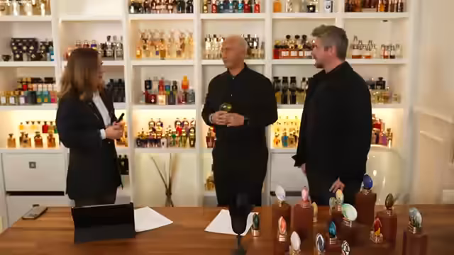 00:51:39Es wird eine besondere Kooperation mit einer Patisseurin aus Polen vorgestellt, die ein Dessert mit fließender Schokolade und Marzipanakkorden sowie Kakao entwickelt hat. Dieses Dessert, bei dem flüssige Schokolade über eine Beere läuft und einen knusprigen Effekt erzeugt, inspiriert einen Duft, der frische, knackige Schokolade mit warmen Noten und verschiedenen Beeren, abgerundet mit gesalzener Vanille, kombiniert. Der Duft wird als essbar beschrieben, mit gefrorener Limette und Mango, und ist auf der Haut sehr warm und pudrig, was ihn angenehm zu tragen macht. Es wird betont, dass die Farben der Flakons die Inhaltsstoffe widerspiegeln, wie zum Beispiel Mango, Vanille und Limette in einem Flakon oder Teesorten wie schwarzer Tee, blauer Tee und Wermut in einem anderen. Dieses raffinierte Design ermöglicht es, schon vor dem Riechen eine Tendenz des Duftes zu erahnen. Die Verbindung von Duft, Architektur, Malerei und Patisserie in einem Flakon wird als freudvoll und unterhaltsam hervorgehoben, da sie viele Lebensthemen vereint, die uns alle betreffen.