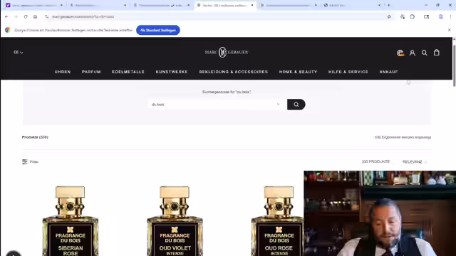 01:32:18Der Streamer startet einen Live-Verkauf mit 50%-Rabatt über den Code TOBI und präsentiert diverse Parfummarken wie Maison T.T., Memo und Parfums Del Mar. Während des Prozesses treten jedoch technische Schwierigkeiten mit der Webseite auf, die dazu führen, dass bestimmte Produkte nicht im Warenkorb oder nicht kategorisiert sind. Der Streamer arbeitet live an der Behebung der Probleme, um den Verkauf für die Zuschauer zu ermöglichen.