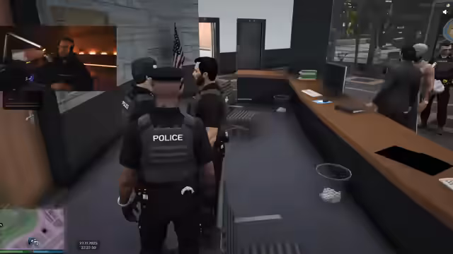 02:22:10Die Spielhandlung wechselt abrupt zur Polizei-Dienststelle im Rollenspiel. Der Streamer, als Officer agierend, muss verschiedene Bürger abfertigen. Es werden komplexe Situationen gespielt, darunter der Drogenhandel, ein überfahrenes Opfer und die Festnahme einer Person namens Herr Salami, die angeblich einen Helikopter geklaut haben soll.