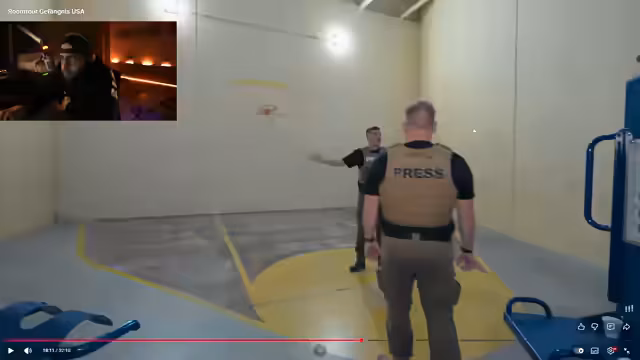 01:36:55Der Fokus des Streams wechselt zu einem geführten Video über ein US-amerikanisches Gefängnis. Ein Guide namens Aaron zeigt die verschiedenen Bereiche, von der Buchung über die Überwachung bis zu den Zellen. Die Atmosphäre wird als bedrückend und unfreiwillig komödiantisch beschrieben. Es wird deutlich, wie die Alltagssituation für die Insassen aussieht, von der drastischen Hygiene bis zur strengen Kontrolle durch das Personal.