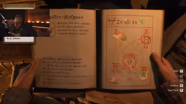 05:50:08Die Suche nach Kräutern wird abrupt unterbrochen, als der Streamer im Spiel auf Banditen trifft, die Hans und seine Männer überfallen haben. Es kommt zu einem Kampf, bei dem der Streamer die Banditen ausschaltet. Anschließend kehrt er zu Bojena zurück, die ihn bittet, ein Kamille-Gebräu für den kranken Hans zuzubereiten. Obwohl Bojena das Rezept besitzt und Erfahrung hat, muss der Streamer die Zubereitung selbst übernehmen. Er muss das Rezeptbuch finden, die Anweisungen lesen und die Zutaten – Kamille, Salbei und Wein – in der richtigen Reihenfolge und Menge in den Kessel geben. Während des Prozesses kommt es zu humorvollen Interaktionen mit Bojena, die trotz ihrer angeblichen Blindheit genau weiß, welche Zutaten fehlen oder falsch verwendet werden. Nach einigen Schwierigkeiten gelingt es dem Streamer, das Kamille-Gebräu erfolgreich zuzubereiten. Bojena bestätigt, dass der Trank richtig ist und Hans bald besser gehen wird. Als Dank für die Hilfe bittet Bojena den Streamer, die Leichen der Banditen zu beseitigen.