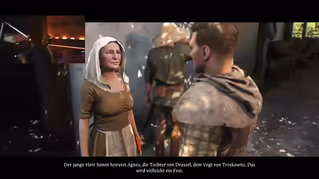 06:47:10Während Heinrich und Hans in der Schenke sind, werden sie von der Wirtin weiterhin unfreundlich behandelt und zur Arbeit angehalten. Heinrich trifft auf Katharina, die Frau vom See, die er zuvor bei einem Banditenüberfall gerettet hatte. Er versucht, sie dazu zu bringen, ihre Identität zu bestätigen, um den Einlass in die Burg zu ermöglichen. Katharina leugnet jedoch vehement, am See gewesen zu sein, und droht Heinrich, wenn er weiter darüber spricht. Sie ist sichtlich verängstigt und möchte die Angelegenheit vertuschen. Die Wirtin mischt sich erneut ein und fordert Heinrich auf, sich zu waschen, bevor er mit ihren Gästen spricht. Heinrich ist frustriert über die Situation und die mangelnde Kooperation. Er erfährt von der Wirtin, dass eine Hochzeit zwischen dem jungen Herrn Sehnen und Agnes, der Tochter des Vogtes von Troskowitz, geplant ist. Diese Hochzeit könnte ihre einzige Chance sein, Herrn von Bergo zu treffen, da er voraussichtlich anwesend sein wird. Heinrich wird geraten, mit den zukünftigen Hochzeitsgästen zu sprechen, um mehr Informationen zu erhalten.