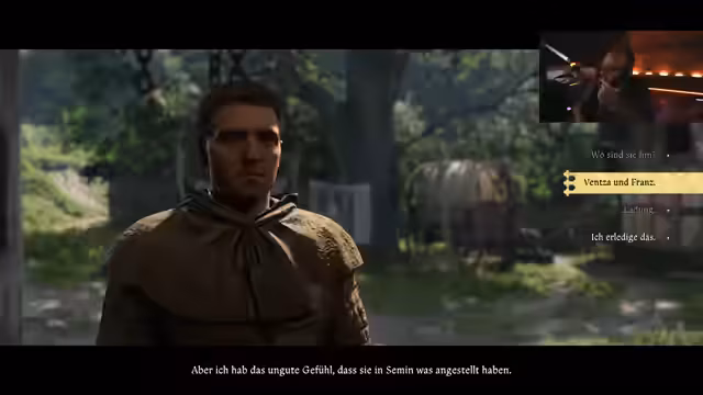06:15:45Der Charakter Heinrich erwacht am nächsten Morgen und fühlt sich deutlich besser, was auf die Wirkung des Kamille-Gebräus zurückzuführen ist. Pavlena, Bojenas Tochter, berichtet, dass Hans ebenfalls genesen ist und unaufhörlich redet. Heinrich reflektiert über seinen Albtraum, in dem sein Vater eine zentrale Rolle spielte. Er beschließt, seine Rachegelüste zu verfolgen und das Schwert seines Vaters zurückzuholen. Pavlena und Hans sind dankbar für Heinrichs Hilfe und Gastfreundschaft. Hans verspricht Heinrich eine Belohnung, sobald ihre Mission bei Herrn von Bergo erfüllt ist. Die Gruppe beschließt, unverzüglich zur Burg Troski aufzubrechen. Dabei wird festgestellt, dass ihr Hund Köter verloren gegangen ist, was Hans jedoch als zweitrangig ansieht. Heinrich besteht darauf, Köter später zu suchen. Es wird auch die Vermutung geäußert, dass Istvan Toss einer der Banditen war, die sie überfallen haben. Die Gruppe macht sich auf den Weg zur Burg, wobei Heinrich von Bojena noch etwas Taschengeld erhält, was die Szene humorvoll abrundet.
