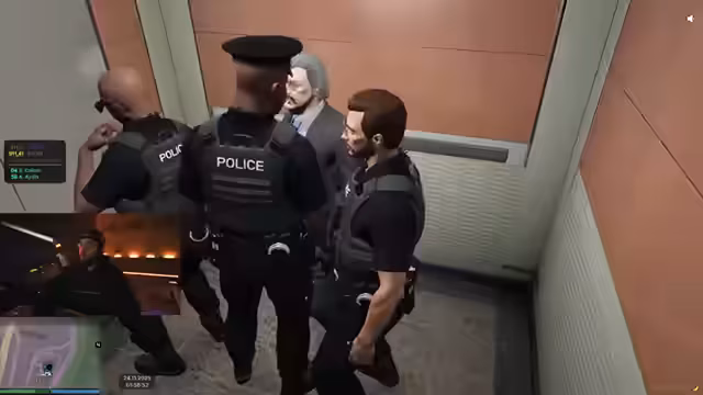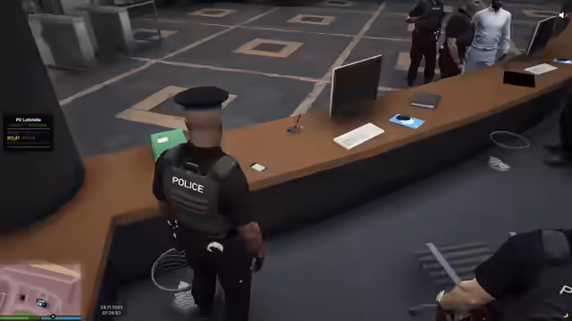 05:42:57Nach anstrengenden Einsatzstunden ist der Dienst offiziell beendet. Die Beamten müssen ihre Dienstwaffen in der Polizeigarage abgeben. Während der Vorbereitung zum Feierabend gibt es eine interne Diskussion über die Zugehörigkeit zu verschiedenen Modulen innerhalb der Organisation. Der Streamer erklärt, dass er sich zwischen zwei Fraktionen, WLA und FPL, nicht entscheiden kann und sich gemischt fühlt. Er erwähnt auch, dass ein Streit mit einem anderen Spieler namens Helmut über ein angegriffenes Flüchtlingshek besteht.