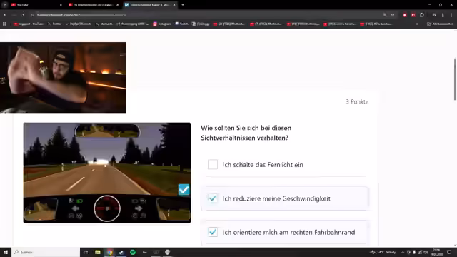 00:40:19Der Streamer nutzt die Fahrschule-App während des Streams, um sich auf die theoretische Fahrprüfung vorzubereiten. Er bearbeitet Multiple-Choice-Fragen und bespricht die richtigen Antworten mit der Community. Pläne für einen First-Aid-Kurs werden erwähnt, der ebenfalls im Stream praktisch geübt werden soll. Der Streamer teilt seine Absicht, den Führerschein in Kürze zu erwerben, und überlegt, ob er die gelernten Inhalte mit der Community teilen kann, um anderen zu helfen. Es wird eine lockere, aber informelle Prüfungssimulation durchgeführt.