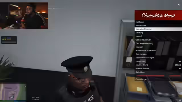 02:22:47Ein Interessent erkundigt sich nach einer Bewerbung beim L.S.P.D. und wird gefragt, ob er sich bereits beworben hat. Er verneint und stellt sich als Lee Han vor. Es wird ihm geraten, sich an der Theke zu bewerben, wenn er dort arbeiten möchte. Der Beamte äußert Zweifel an den Fähigkeiten des Bewerbers, ermutigt ihn aber, es trotzdem zu versuchen, da es 'jeder schon mal reingeschafft' habe. Eine kurze Unterhaltung über frühere berufliche Tätigkeiten offenbart, dass der Bewerber ein Praktikum beim MD gemacht hat und die dortigen Verhältnisse als chaotisch und die Leute als 'komisch' empfand. Es wird bestätigt, dass das MD 'vollgestopft mit Psychopathen' sei. Später trifft der Beamte auf einen ehemaligen Kollegen, Herrn Hofmann, der freiwillig bei der Polizei gekündigt hat und nun als Voldemort-Cosplayer auftritt. Hofmann bietet sogar eine Therapiesitzung als Psychotherapeut an, was auf humorvolle Weise angenommen wird.
