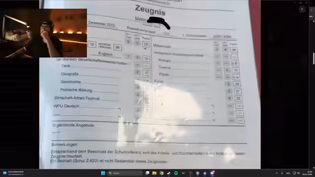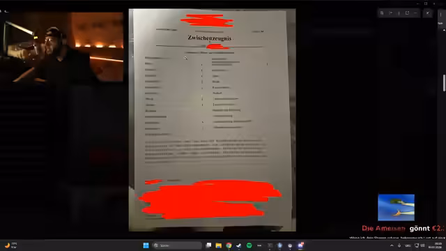 00:16:25Der Streamer wechselt das Thema und beginnt mit der Diskussion über Schulzeugnisse, nachdem mehrere Zuschasser ihre Noten geteilt haben. Er betrachtet verschiedene Zeugnisse, kommentiert Noten in Fächern wie Deutsch, Mathe und Chemie und vergleicht das Notensystem mit seinem eigenen. Es wird über unterschiedliche Notenskalen, wie die in der Schweiz, gesprochen und der Streamer teilt auch eigene Erfahrungen mit Fächern wie Latein, die er als schwierig beschreibt.