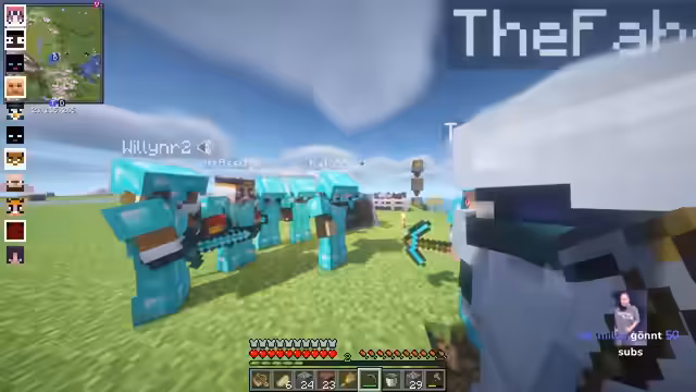 00:29:19Der Streamer trifft auf mehrere Spieler wie Sägen, Trimax und Nodic und tauscht sich über deren Status und Ausrüstung aus. Er diskutiert die Bildung von Gruppen und Allianzen, erwähnt dabei explizit ein Königreich um Peppi und Knossi. Die Interaktion zeigt die Dynamik auf dem Server, wobei Warnungen vor Trimax laut werden, der als aggressiver Spieler beschrieben wird. Der Streamer betont die Notwendigkeit, sich zusammenzuschließen, um zu überleben.