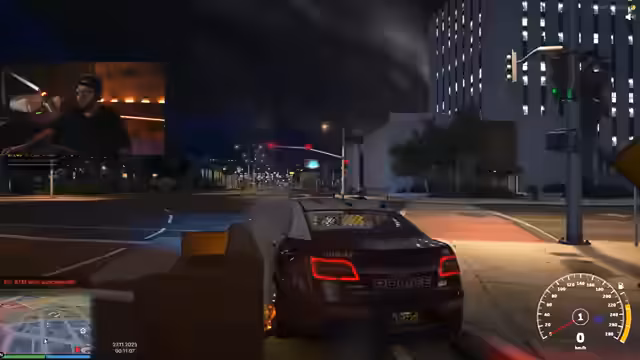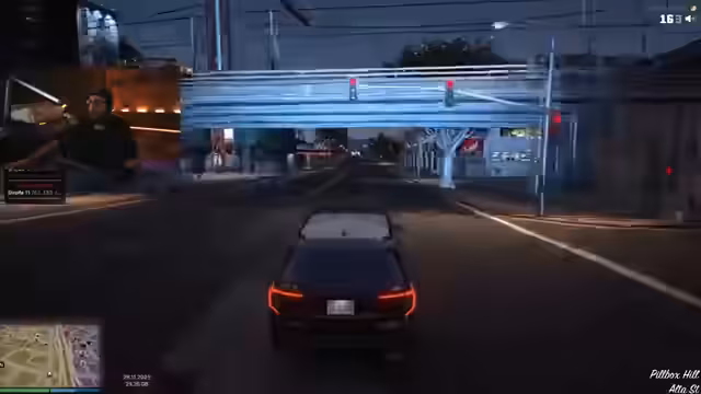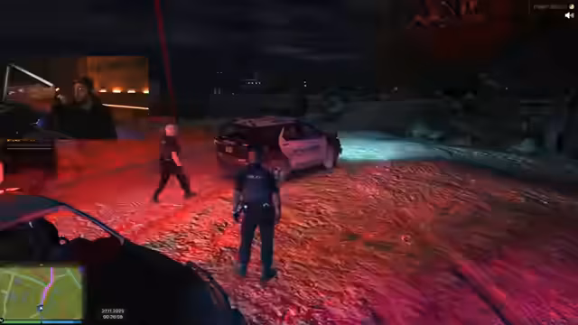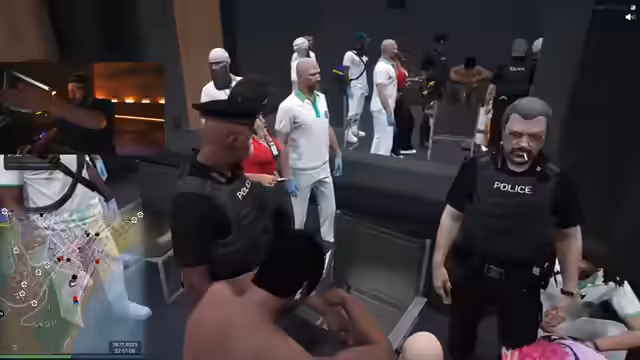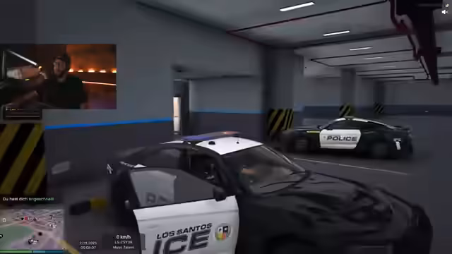 01:45:44Der Stream wechselt vom Erkundungsvideo zum GTA RP. Die Charaktere, darunter der Kommentator und ein Kollege, übernehmen Rollen in der Polizei (LSPD). Sie melden sich zur Schicht ein, werden jedoch bereits kurz darauf während einer Routinekontrolle von bewaffneten Tätern überfallen. Dabei werden ihre Dienstwaffen gestohlen und sie aus dem Dienstwagen gedrängt.